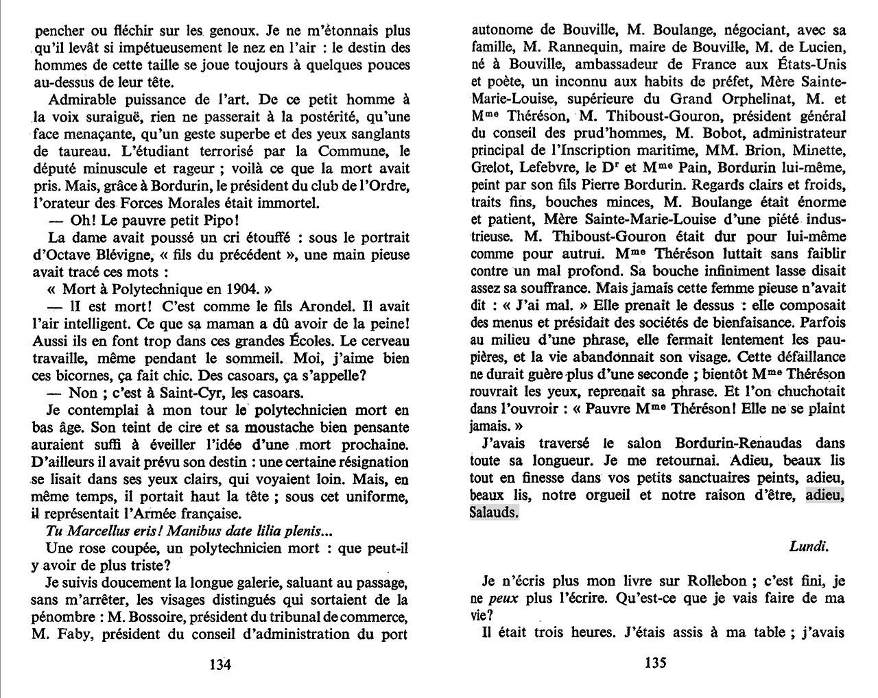 두 번째 부분은, 주인공이 자신이 사는 소도시의 박물관에 가서 그 지역의 귀족들을 기리는 초상화들을 보는 장면이다. 마침 한 가족이 들어와서 벽에 걸린 귀족들의 초상화를 본다. 아버지가 아들에게 훌륭한 조상들에 대해 훈시를 한다. 주인공은 그럴듯한 세팅에 장엄한 포즈를 취하고 있는 초상화 속의 인물들을 보면서 그 그림들 뒤에 있는 나약한 인간의 모습을 꿰뚫어 본다. 그리고 박물관을 나오면서 혼잣말을 한다. "안녕. 개새끼들아." (Adieu. Salauds).