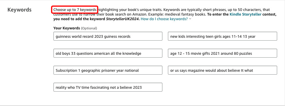 아마존은 이렇게 키워드 타겟팅을 하기 위해 키워드를 쑤셔넣는 행위를 keyword stuffing이라고 해서 검색결과에 부정적인 영향을 미칠 것이라고 경고하지만, 실제로는 여전히 많은 작가들이 타겟팅하는 여러 개의 키워드를 넣은 기다란 제목의 컬러링북을 출판하고 있습니다. (그리고 아마존의 경고에도 불구하고, 이런 책들이 검색결과 상위에 있는 것을 보면 아직도 효과가 있는 것으로 보입니다. )