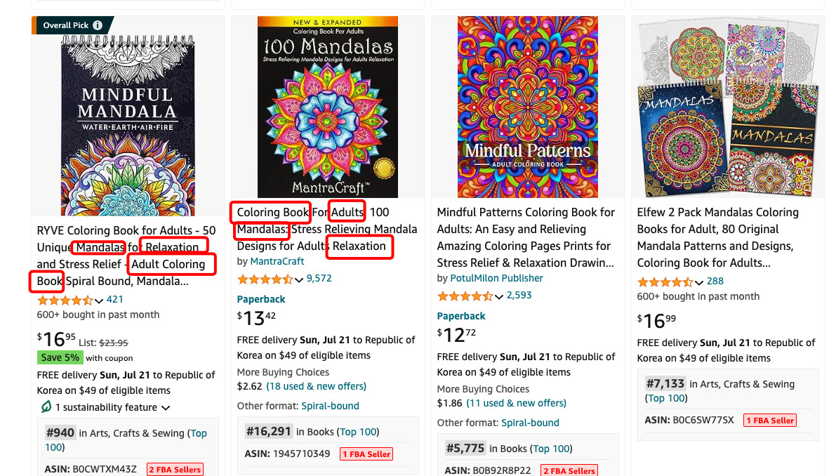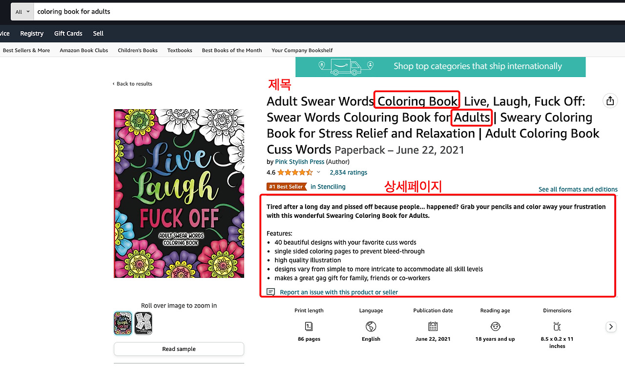 성인을 위한 컬러링북 (coloring book for adults)라는 키워드로 검색하면 상위에 뜨는 위의 책을 보면 고객들이 검색하는 키워드가 책의 제목에 모두 들어간 것을 알 수 있습니다.