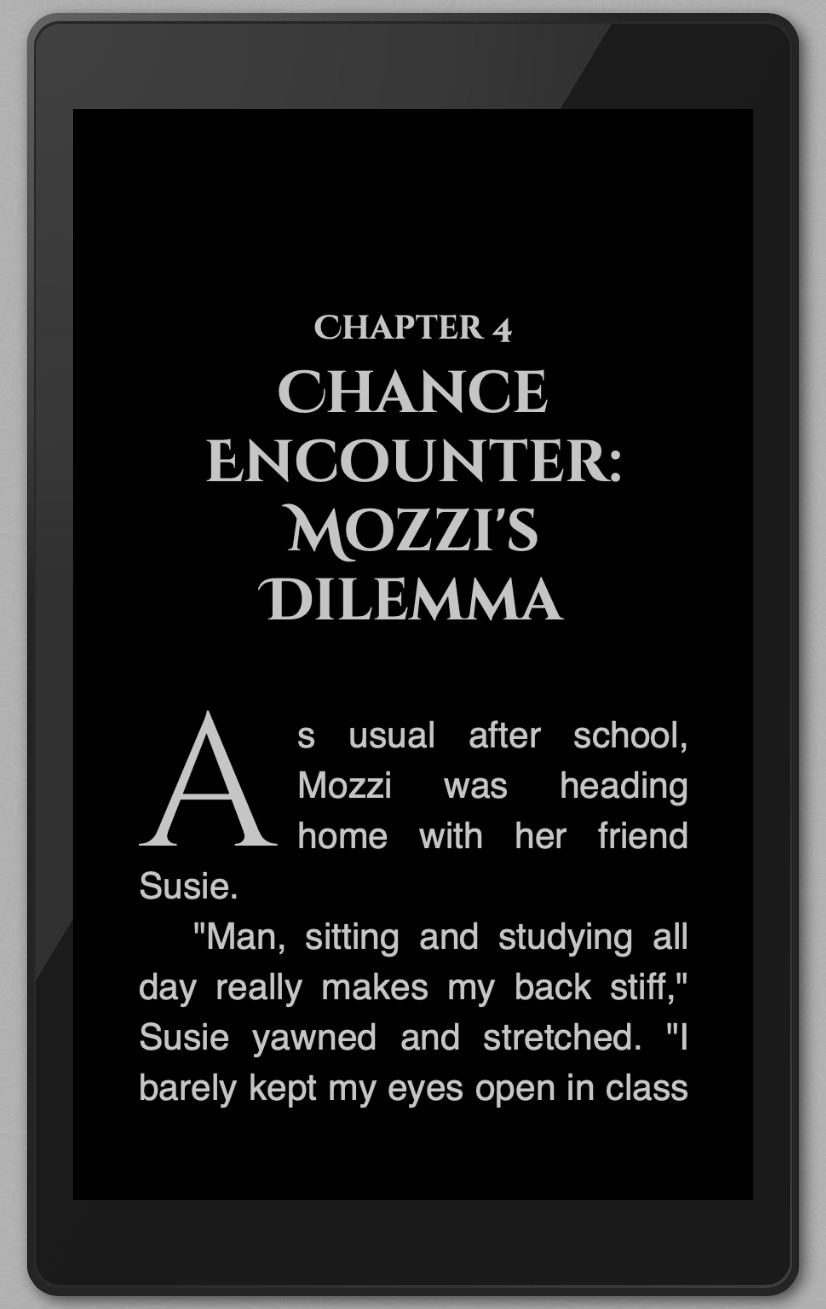 예를 들어 아래의 첫번째 이미지는 아마존 파이어 태블릿의 킨들 앱에서 폰트 크기 최대, 배경 검은색, 헬베티카 폰트라는 옵션을 선택한 독자가 보게되는 전자책입니다. 동일한 책을 아이폰의 킨들 앱에서 폰트 크기 최소, 배경 하얀색, 팔라티노 폰트로 설정해서 보면 두번째 이미지처럼 보입니다.