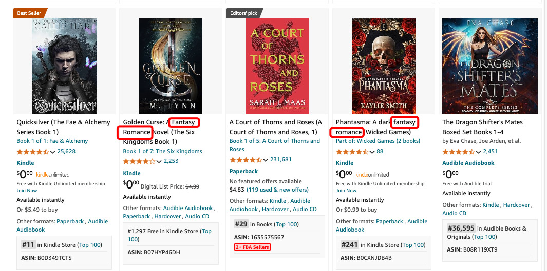 첫번째 변수를 설명할 때 fantasy romance books라는 키워드가 매달 1만5천번 이상 검색되는 것을 보았습니다. fantasy romance (팬터지 로맨스)를 검색하면 뜨는 베스트 셀러들의 제목을 보십시오. 2권의 책이 아예 책의 부제목에 동일한 단어를 넣었습니다. 다른 책들 역시 고객에게는 노출되지 않는 키워드에 같은 키워드를 넣었을 가능성이 100 퍼센트입니다.