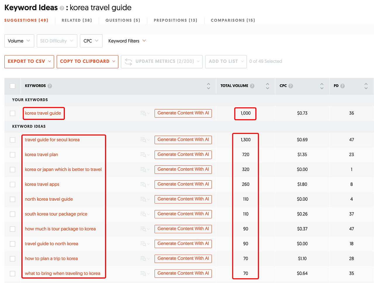 반면에 한국 여행 가이드북에 대한 검색량은 전세계적으로 한 달에 1,000명입니다.