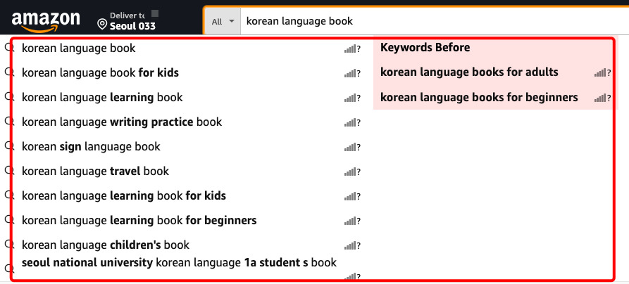 예를 들면 아마존에서 한국어 학습서를 검색하면 아래와 같은 키워드들이 자동완성으로 보입니다.