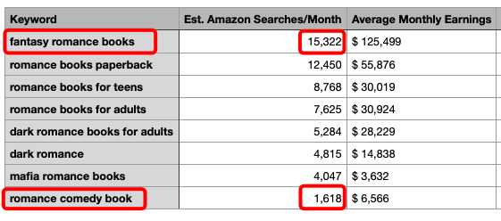이것은 살빼는 법 같은 논픽션 주제에만 국한된 것은 아닙니다. 아마존 마케팅 소프트웨어 Publisher Rocket으로 분석한 로맨스 소설의 검색량입니다.
