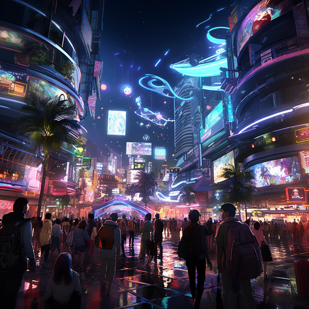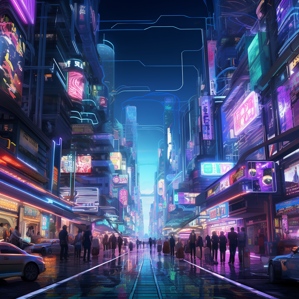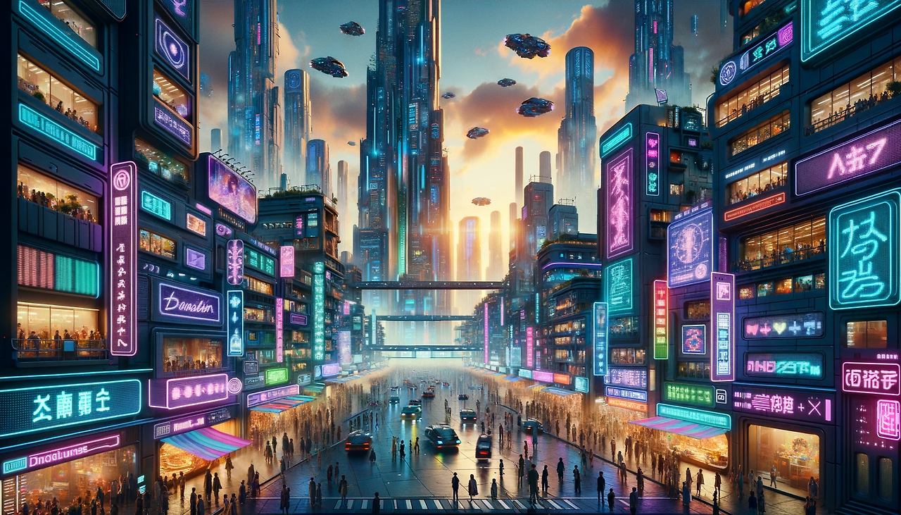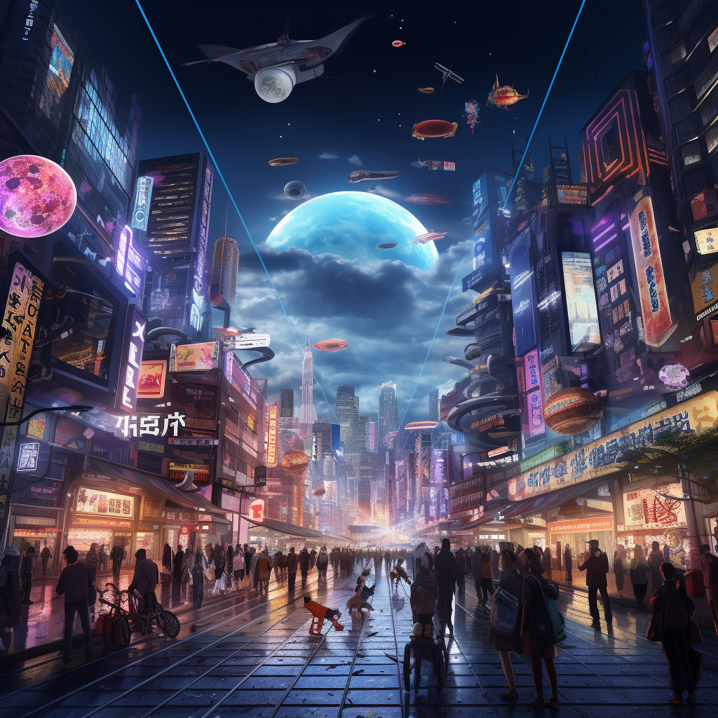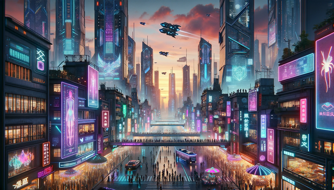Purpose: This prompt assesses the AI's ability to generate intricate details and manage complex urban scenes. It also evaluates how well the AI can combine different architectural styles and depict a scene bustling with life and technology.