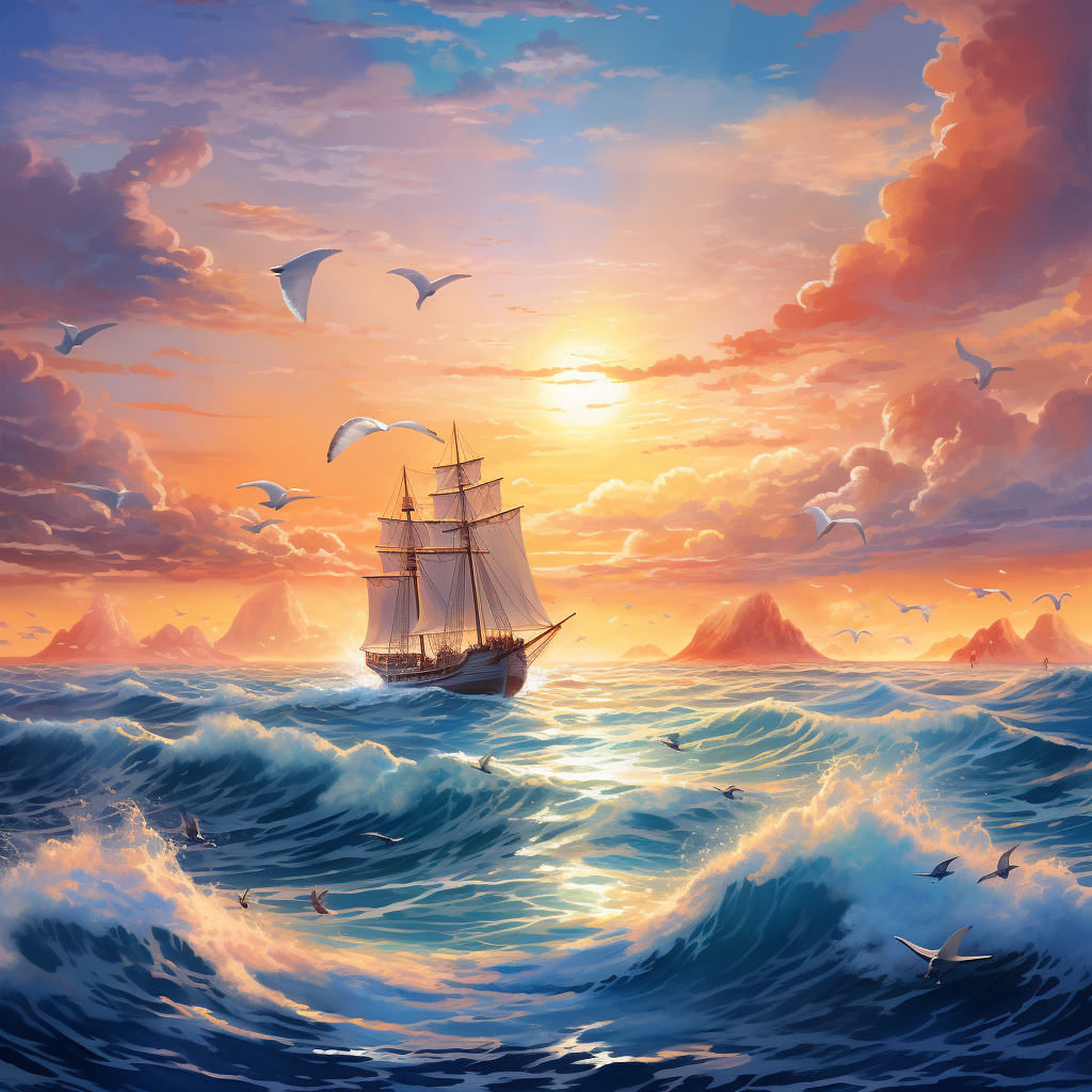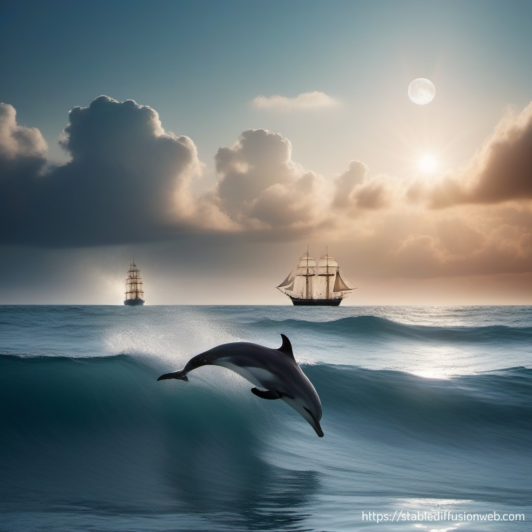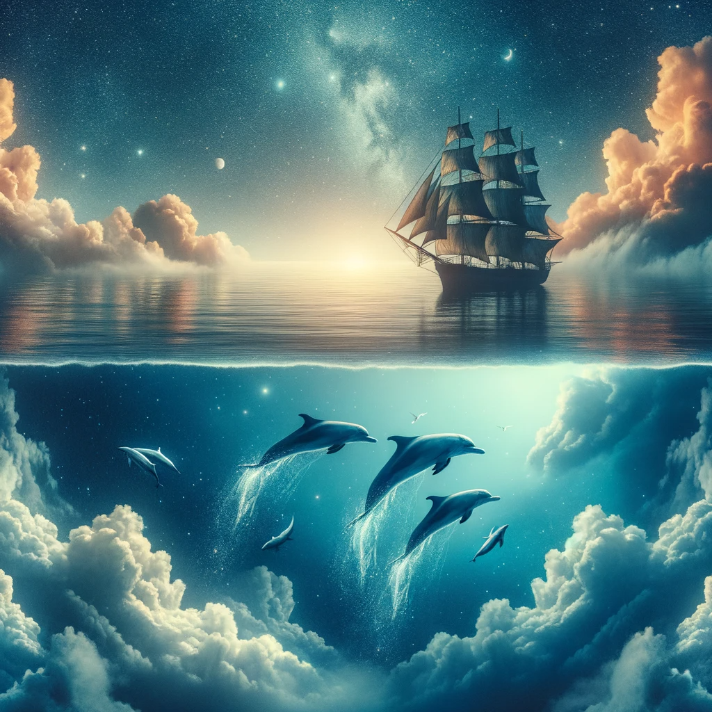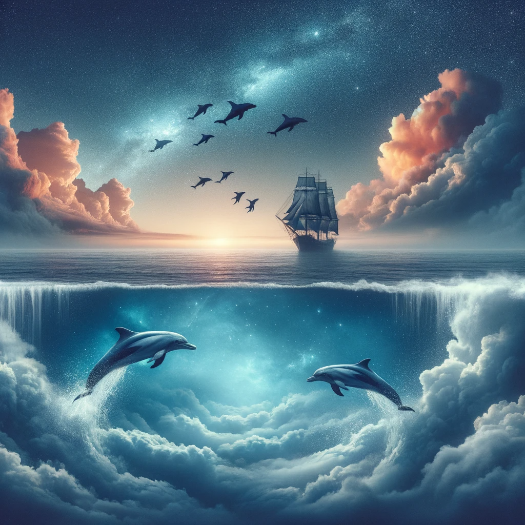Prompt: "Create an image of a dreamscape where the ocean merges with the sky at the horizon. In this seamless transition, dolphins are leaping across the boundary, with half of their bodies in the water and the other half soaring through the clouds. The scene is lit by a gentle twilight glow, and a distant old sailing ship floats between the two realms, its sails billowing with stars instead of canvas."