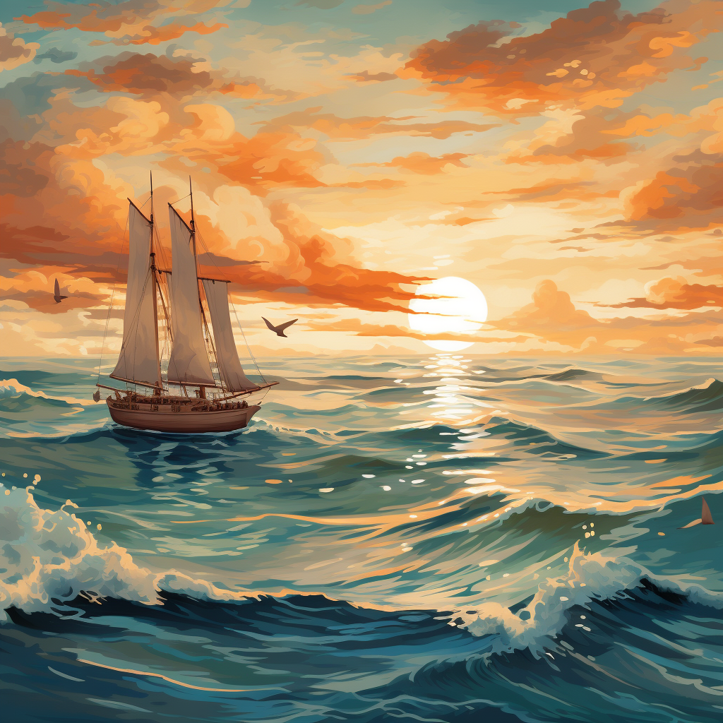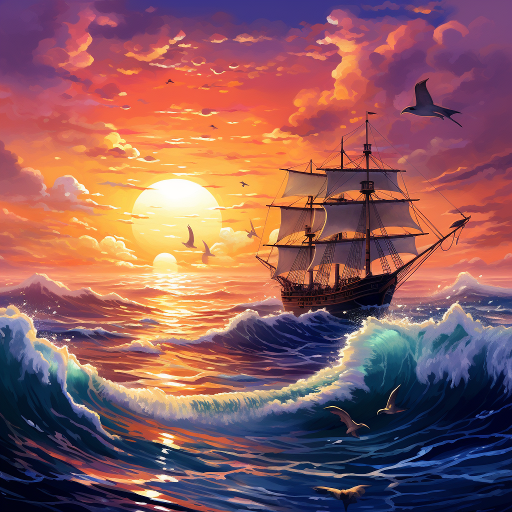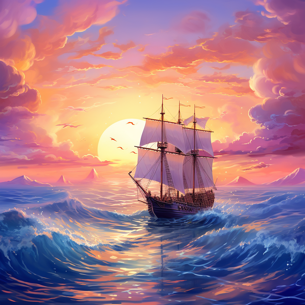 Prompt: "Create an image of a dreamscape where the ocean merges with the sky at the horizon. In this seamless transition, dolphins are leaping across the boundary, with half of their bodies in the water and the other half soaring through the clouds. The scene is lit by a gentle twilight glow, and a distant old sailing ship floats between the two realms, its sails billowing with stars instead of canvas."