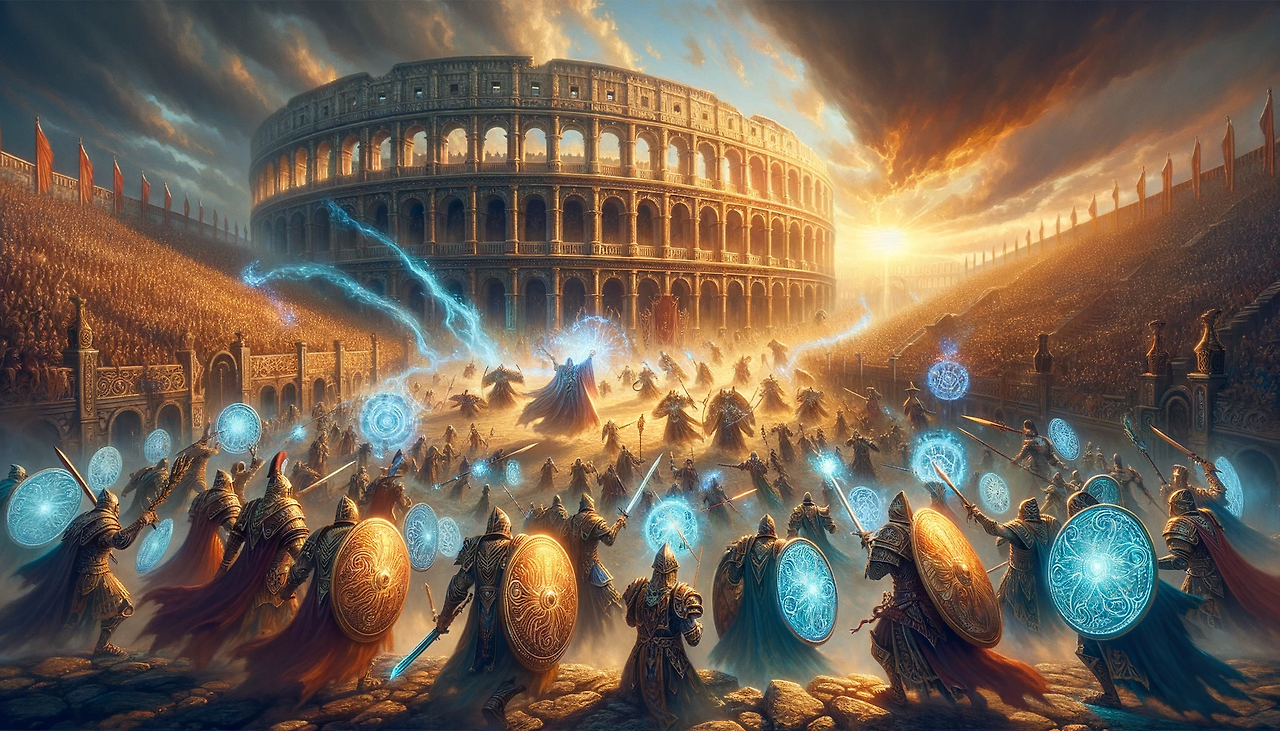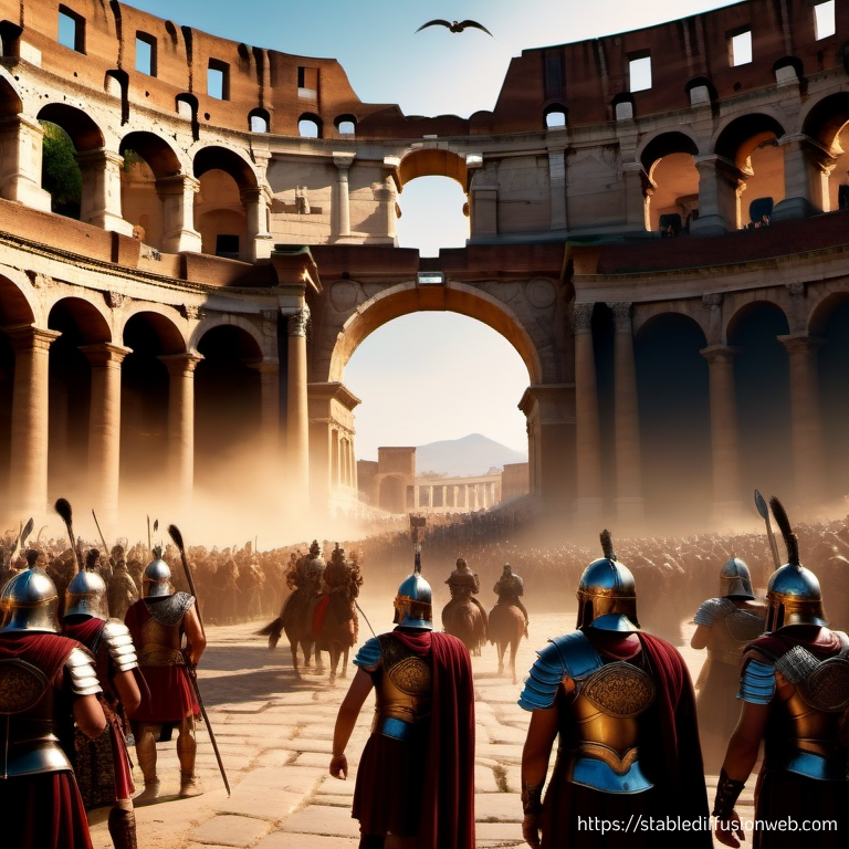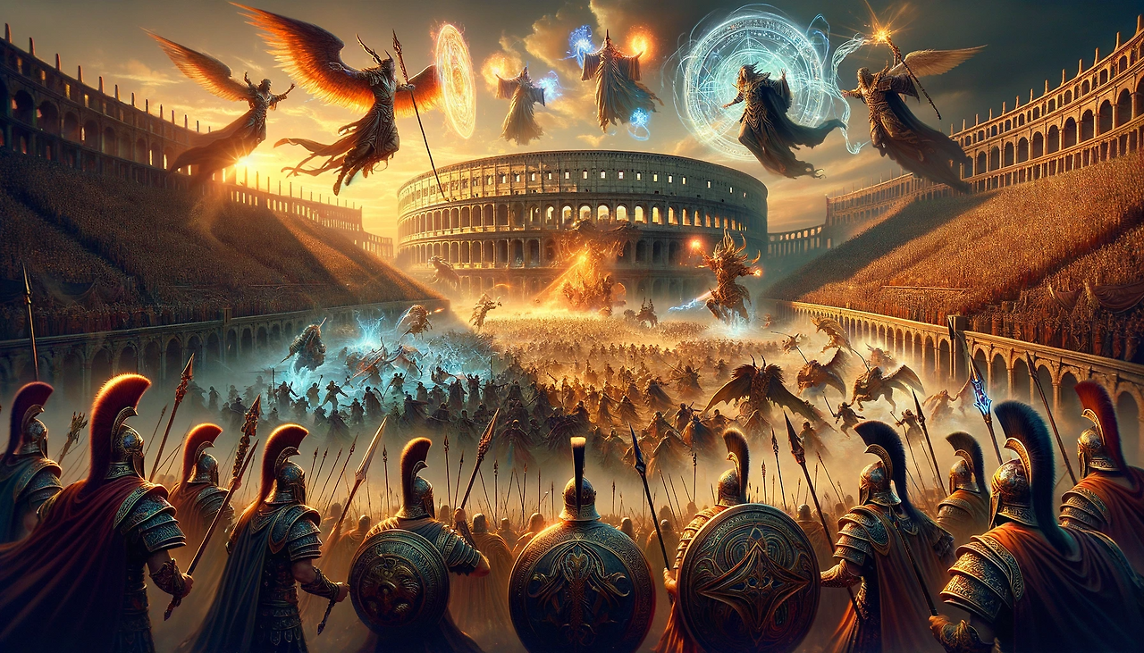 프롬프트: "고대 로마의 판타지 버전을 배경으로 한 장대한 역사적 전투를 묘사합니다. 전경에서는 반짝이는 마법의 방패로 무장한 로마 군단이 신화 속의 동물들과 싸우고 있습니다. 전투 위에는 마법사 두 사람이 하늘에 물결을 일으키는 주문을 시전 하며 결투를 벌입니다. 지는 해는 거대한 콜로세움을 배경으로 혼란스러운 전장에 극적인 그림자를 드리우고 관중들은 그 아치에서 지켜보고 있습니다."