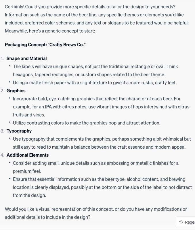 패키지 디자인 전체가 아니라 라벨을 만들어 주었습니다. 달리-3는 생맥주 패키지 디자인을 만들어 달라는 프롬프트를 받고서, 생맥주병은 빼버리고, 라벨을 만들어 주는 것으로 보아 디자인 관행이나 디자인 문법에 대한 정보를 거의 보유하고 있지 않은 것 같습니다.