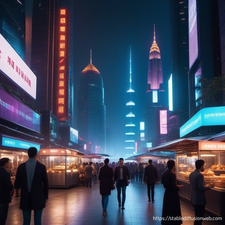 Prompt: "Illustrate a bustling futuristic metropolis at dusk, reflecting a blend of neo-noir and cyberpunk aesthetics. Skyscrapers with holographic signs tower above, while flying cars navigate neon-lit skyways. Below, diverse crowds of people and androids mingle on the streets, which are alive with interactive digital storefronts and robotic street vendors selling exotic, glowing street food."