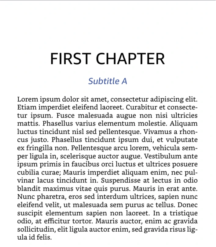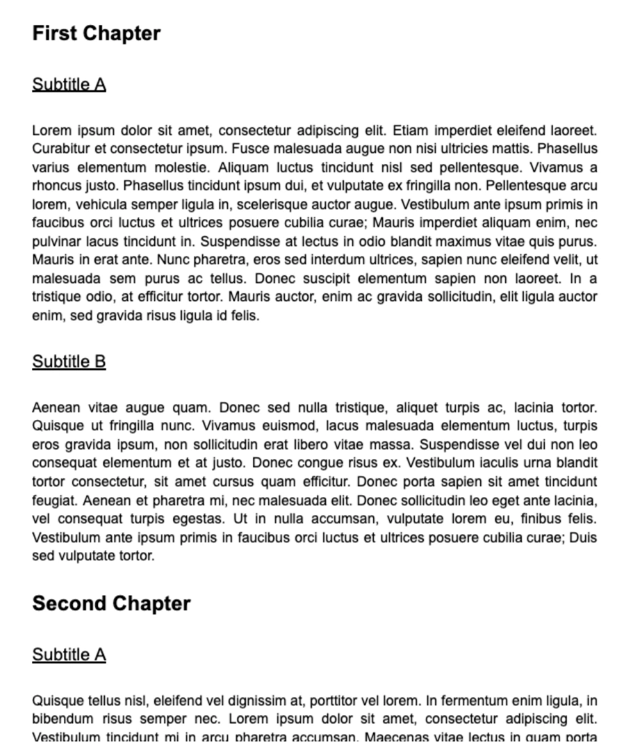 원고 양식은 이미지처럼 챕터, 서브 챕터 두 가지로만 구분하면 전자책 편집이 쉬워집니다. 원고의 구조를 복잡하게 만들면 전자책의 가독성이 떨어지고, 전자책 편집 작업도 복잡해집니다.