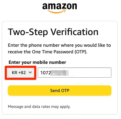 7) 국가를 한국으로 선택하고, 0을 뺀 나머지 휴대폰 번호를 대시없이 그대로 넣어줍니다. Send OTP 버튼을 누릅니다.