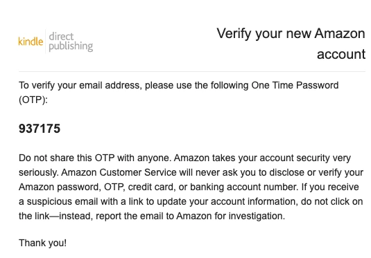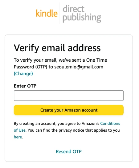 4) 아마존이 보낸 이메일에 들어가 있는 OTP를 넣어주고, Create your Amazon account를 누릅니다.