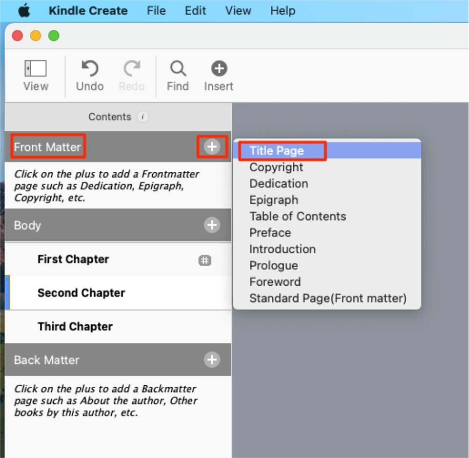 Front Matter 우측의 플러스 버튼을 누르고 Title Page를 클릭합니다.