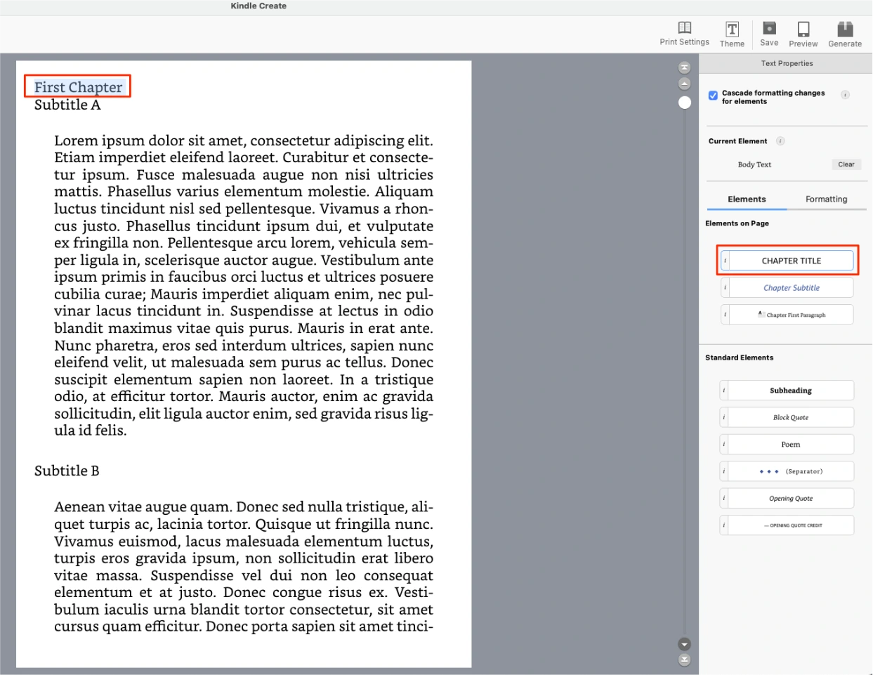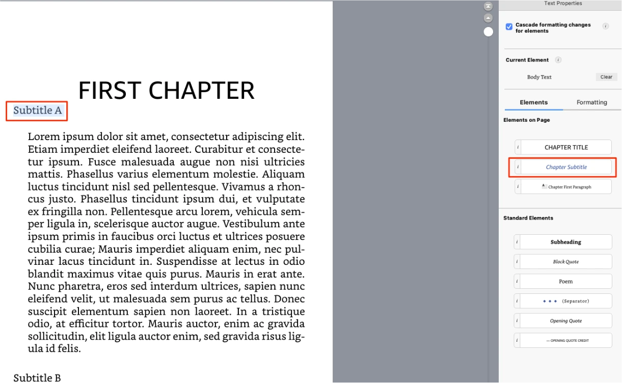 서브챕터 제목을 마우스 드랙으로 선택해주고, 우측에 챕터 서브타이틀버튼을 눌러줍니다.