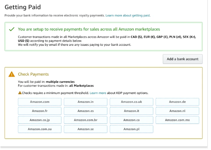 11) Getting Paid라는 제목과 함께 인세가 수표로 지급된다는 안내문이 뜹니다. 현재 아마존 인세는 한국의 은행계좌로 받을 수 없습니다. 미국 은행계좌로만 받을 수 있습니다. 페이오니어라는 사이트에 가입해서 미국 은행계좌를 만들 수 있습니다. 아마존 인세는 책의 매출이 발생한 시점으로부터 2개월 후에 지급되므로 미국 은행 계좌를 만드는 작업은 나중에 하셔도 됩니다.