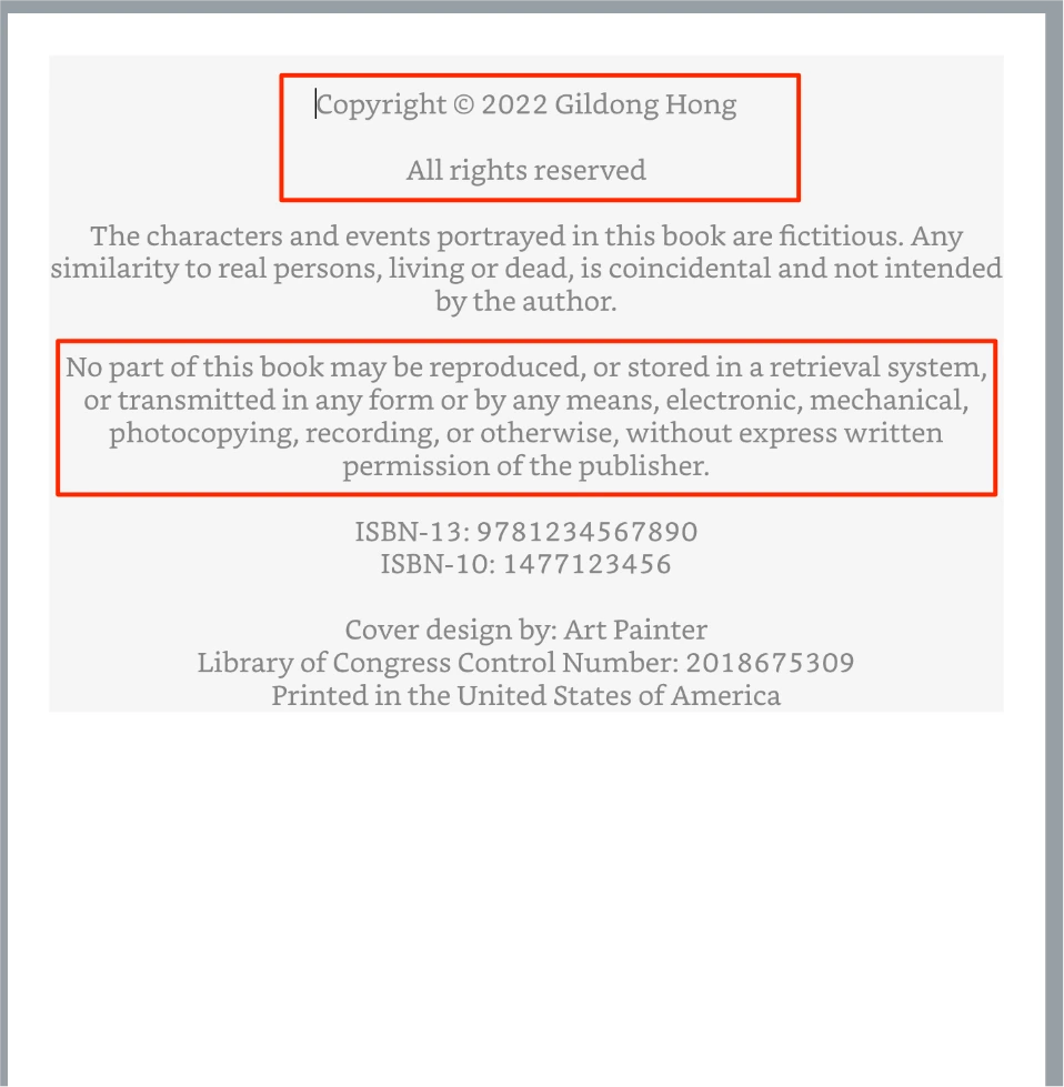 만들어진 Copyright Page에서 빨간 박스로 표시한 부분이 필수적인 요소입니다. 프로그램 오른쪽의 Edit Page 버튼을 눌러 필요한 부분만 남기고 나머지는 지웁니다. 아마존 전자책은 ISBN이 없어도 출판가능합니다. 다시 Create Page를 클릭합니다.
