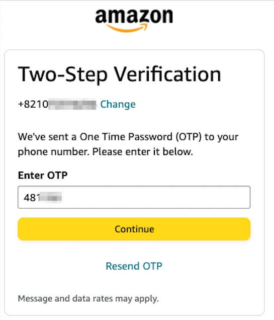 8) 휴대폰으로 온 메시지에 들어가 있는 여섯자리의 OPT를 넣어주고 Continue 버튼을 누릅니다.