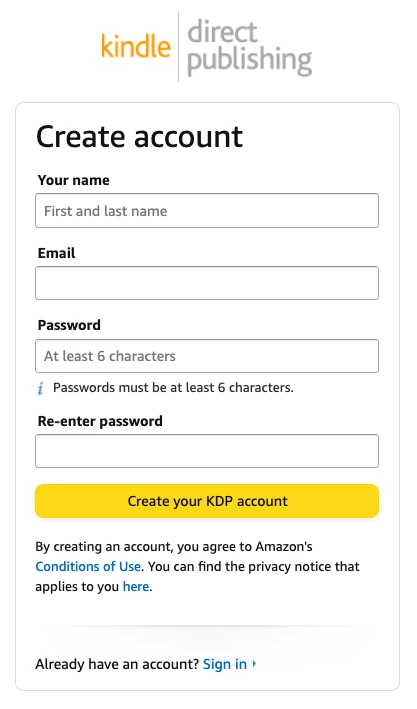 2) 이름, 이메일, 새로 만든 비밀번호를 넣어줍니다. 이름은 영문으로 이름, 성의 순서로 넣어줍니다. Create your KDP account를 누릅니다. 이미 아마존 계정이 있는 경우에는 아래의 Sign in을 누릅니다. 아마존 계정이 이미 있는 경우에는 Sign in을 누르고 이메일, 비밀 번호를 넣으면 바로 약관이 뜹니다. 이때는 5)번으로 갑니다.