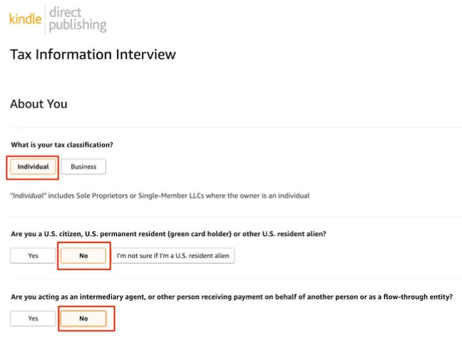 13) Tax classification 에서 개인을 선택하고, 미국 시민이나 거주자 아님, 대리가 아닌 본인임을 표시하기 위해 모두 No를 선택합니다.