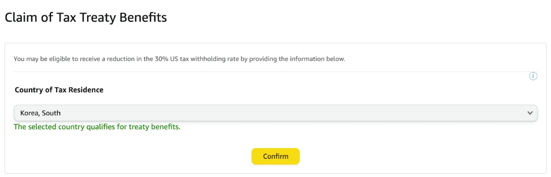 15) 국가를 한국으로 선택하고 Confirm을 클릭합니다. 한미 조세조약에 따라 미국 소득세 원천징수 비율인 30% 보다 낮은 비율이 적용된다는 내용이 나옵니다. 한국인에게는 10%가 적용됩니다.