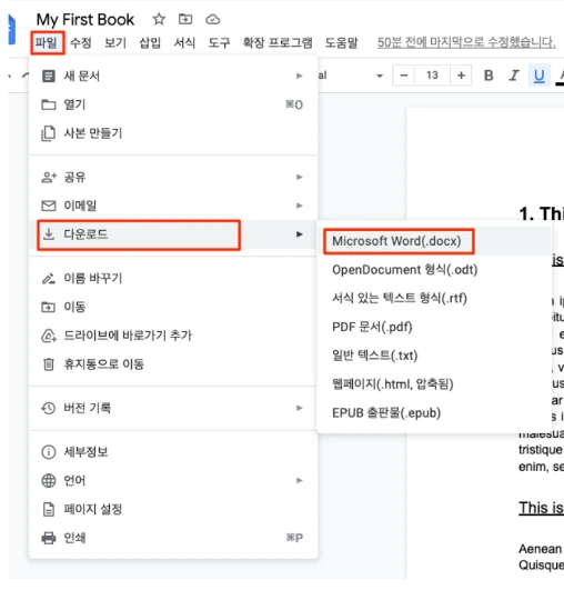 구글문서를 이용하는 경우 메뉴에서 파일 - 다운로드- Microsoft Word (docx)를 선택해서 완성된원고를 다운받습니다. 다운 받은 화일로 전자책을 만들면 됩니다.