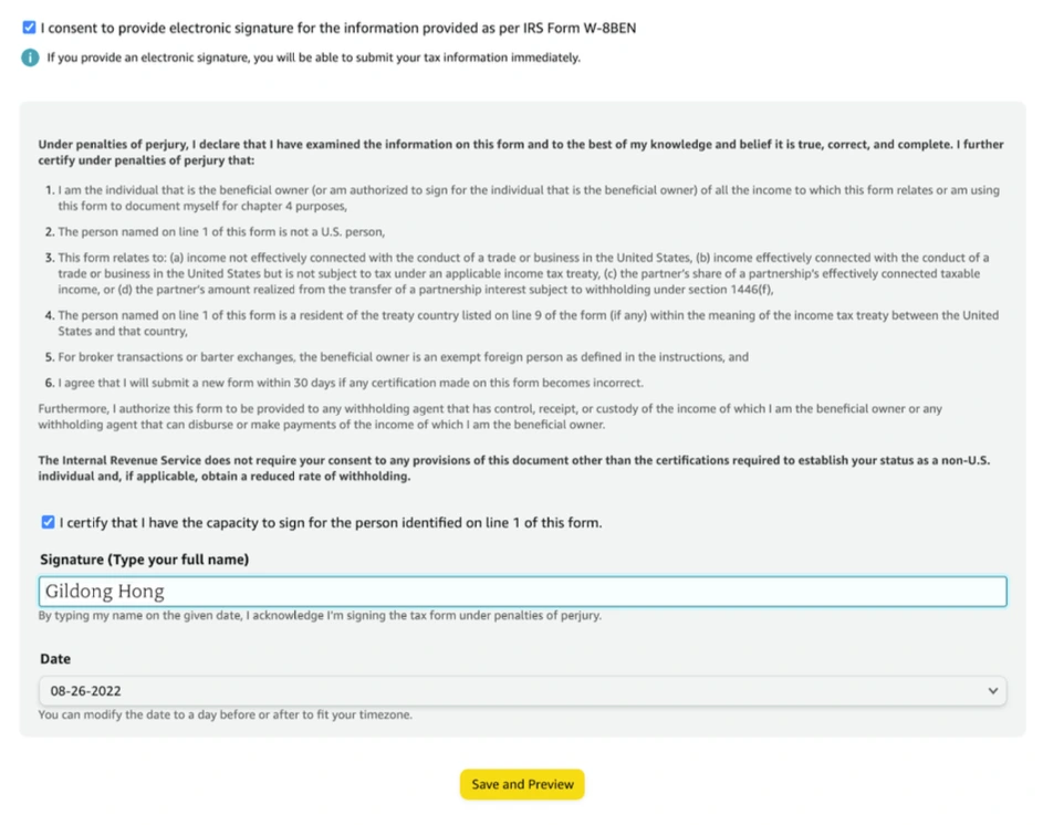 16) 체크박스를 다 선택해주고, 영문 성명을 넣어줍니다. Save and Preview를 눌러줍니다.