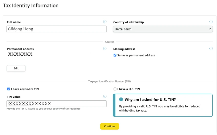 14) 이름, 성의 순서로 성명을 넣어주고, 국가와 주소를 넣어줍니다. I have a Non-US TIN (미국 외 지역의 납세자 확인번호)를 선택하고 주민등록번호를 대시까지 포함해서 그대로 넣어줍니다.