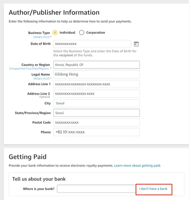 10) Legal Name은 반드시 여권에 적힌 영문과 동일하게 넣어줍니다. 이름과 성의 순서로 넣어줍니다. 영문주소와 우편번호, 휴대폰 번호를 넣어줍니다. Getting Paid (인세)에는 우선은 I don’t have a bank. (은행계좌 없음)를 선택합니다.