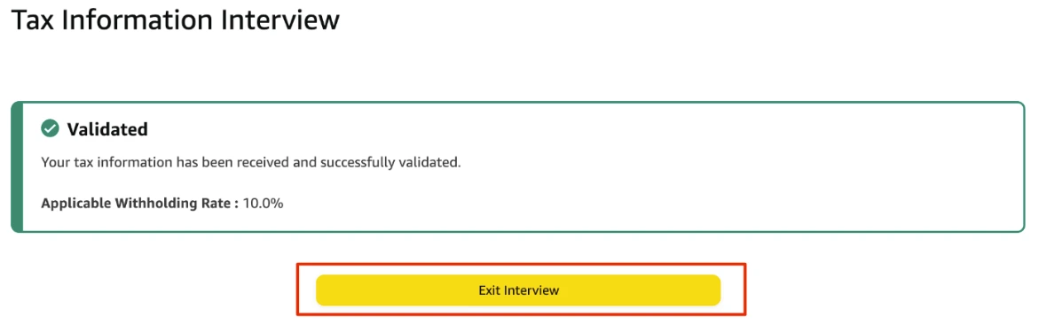 18) 아마존 로얄티에 대해 10%의 원천징수가 적용된다는 메시지가 뜹니다. 이것으로 세금관련 양식 작성은 끝났습니다. Exit Interview를 클릭합니다