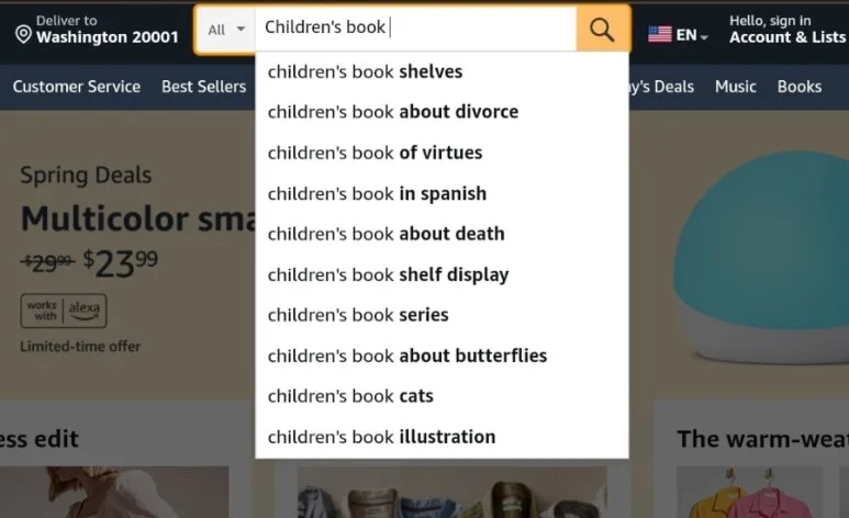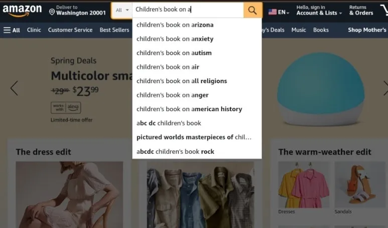 아마존 사이트에서의 키워드 검색 자동완성 기능을 활용하면 이러한 틈새 시장을 찾을 수 있습니다.
