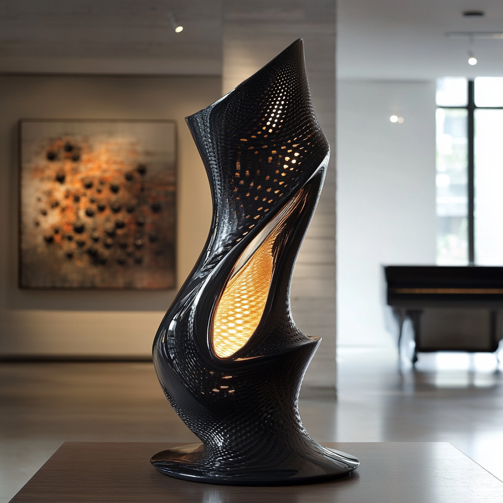 미드저니 프롬프트: Futuristic sculptural table lamp designed by Zaha Hadid, using carbon fibre, set in a contemporary art gallery, illuminated by ambient lighting. (Zaha Hadid가 디자인한 미래 지향적인 조각형 테이블 램프, 탄소 섬유, 현대 아트 캘러리)