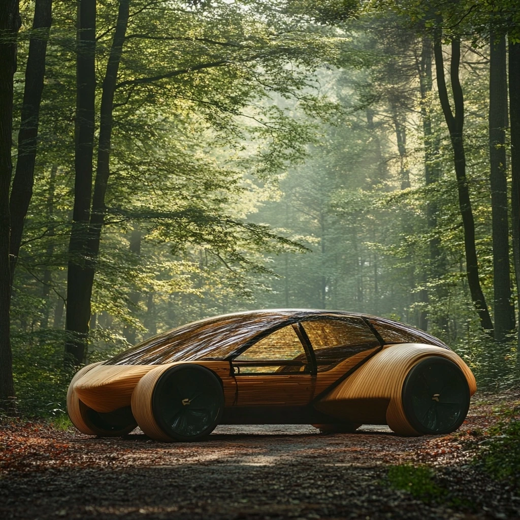 미드저니 프롬프트: A car designed by Philippe Starck, featuring sustainable wood in an organic style, set in a forest, captured during soft morning light. (필리프 스탁이 디자인한 전기차, 탄소 섬유와 유리를 사용한 유선형 디자인, 숲 배경, 아침 조명)