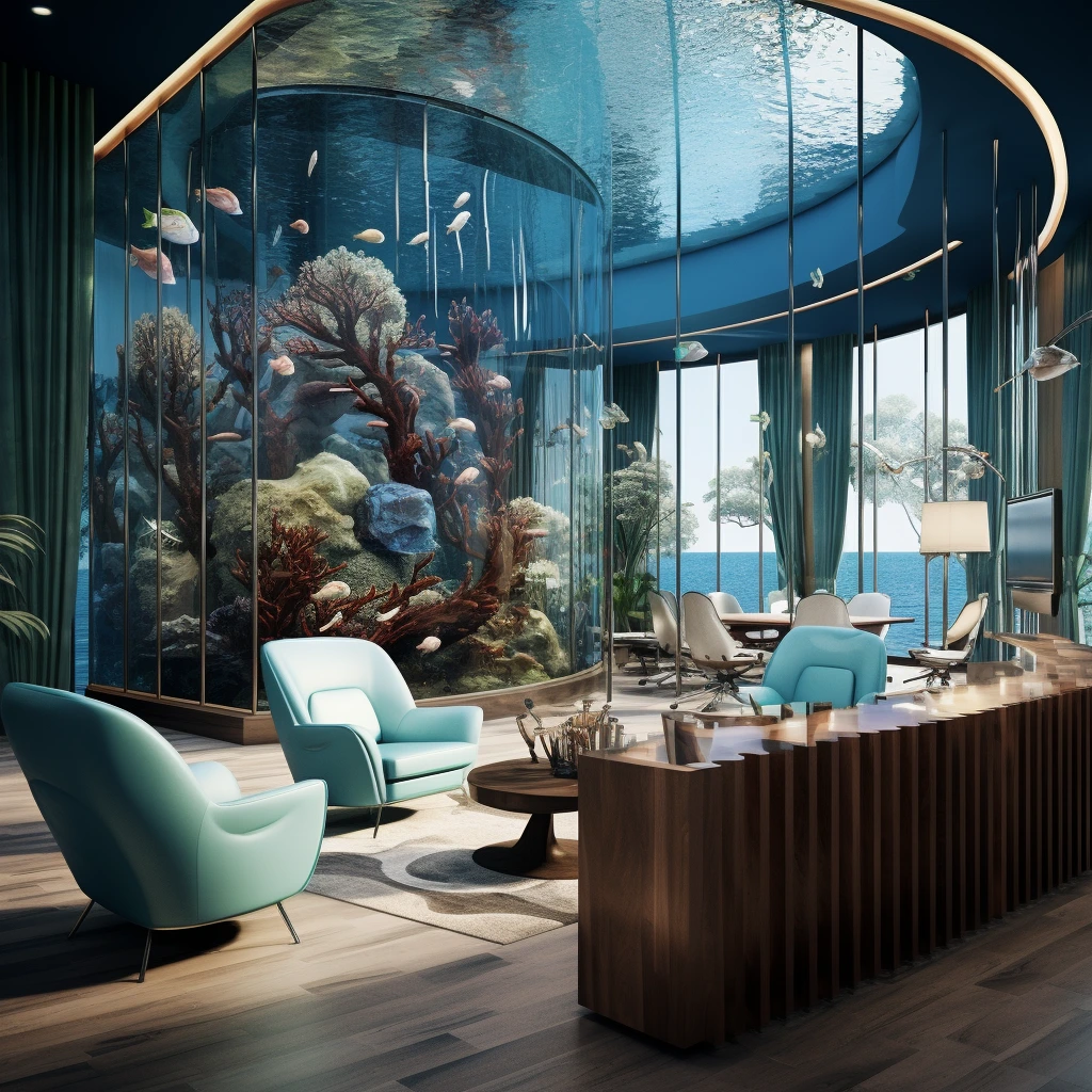 수중 테마 사무실 단지: 대형 수족관 벽면, 해양을 영감으로 한 예술 설치물, 안정적인 청색 색상 계통을 갖춘 수중 테마의 사무실 단지를 상상해봅니다. 평온함과 창의성을 일깨우는 디자인으로, 수중 환경을 모방한 공간을 구성합니다.