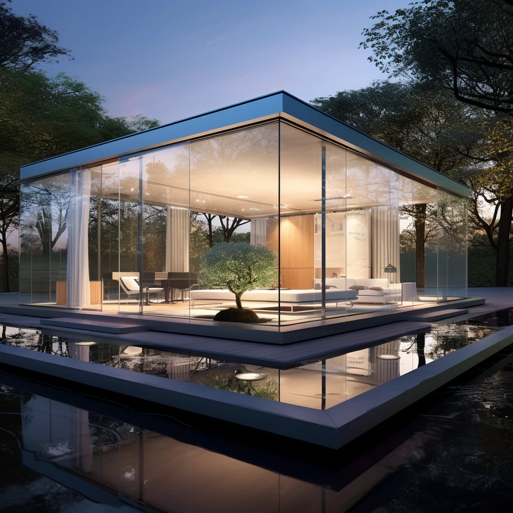 미니멀리스트 유리 사무실 파빌리온: 투명한 유리로 이루어진 미니멀한 사무실 파빌리온을 상상해봅니다. 조용한 수면기능을 갖춘 수상 요소로 둘러싸인 공간입니다. 내부는 모듈식 가구로 구성된 개방형 평면을 보여주며, 외부는 주변 풍경을 반영하여 평온하고 생산적인 환경을 조성합니다.