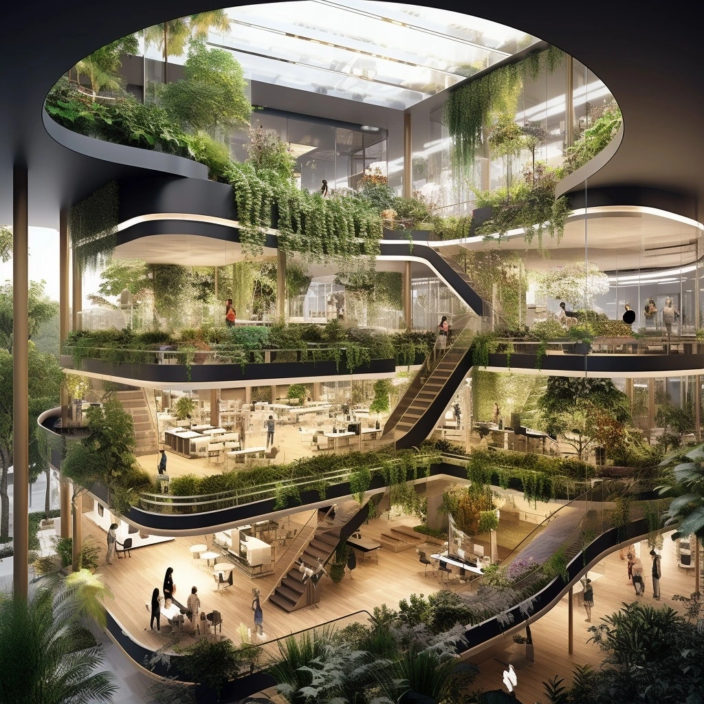 지속 가능한 도시 정원 사무실: 지붕 정원, 실내 수직 정원, 지속 가능한 재료와 에너지 효율적인 디자인을 강조하는 사무실 건물을 만듭니다. 이 공간은 환경 인식과 건강한 라이프스타일을 장려합니다.