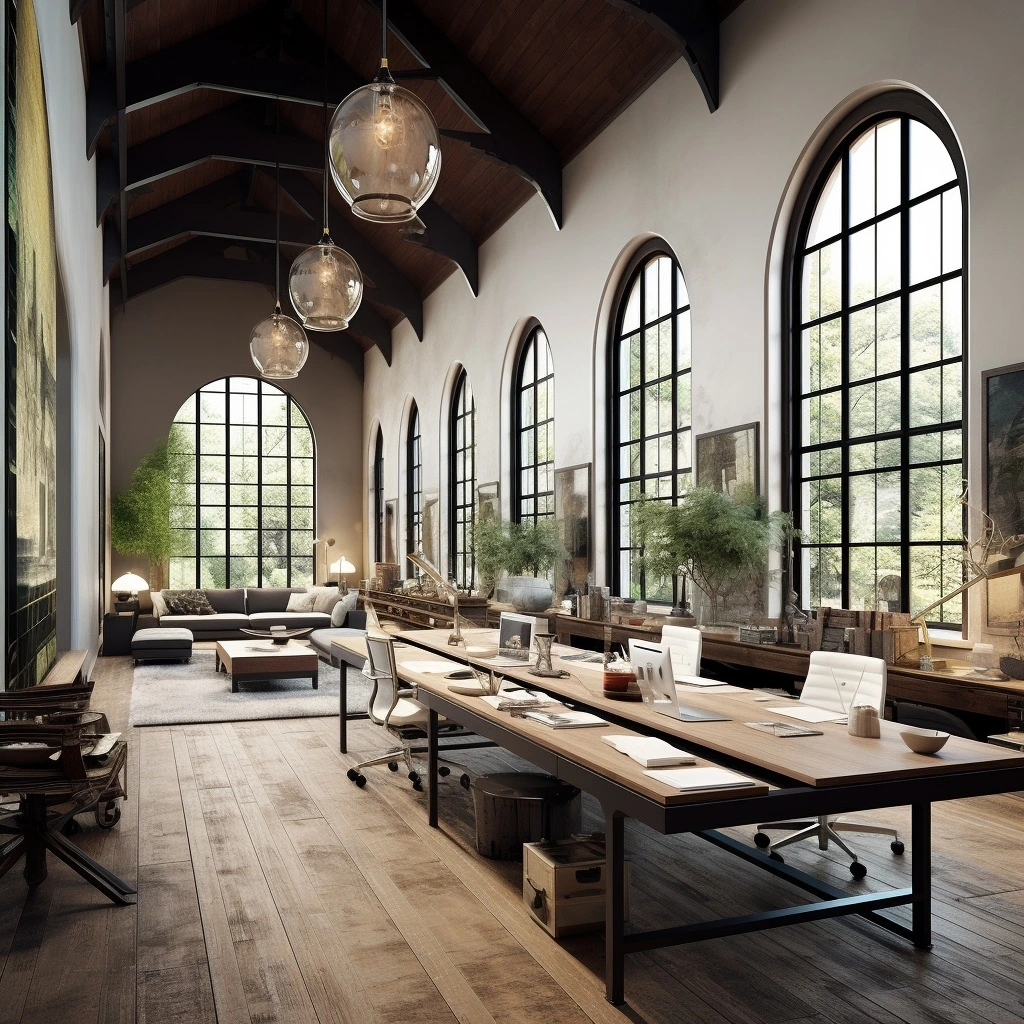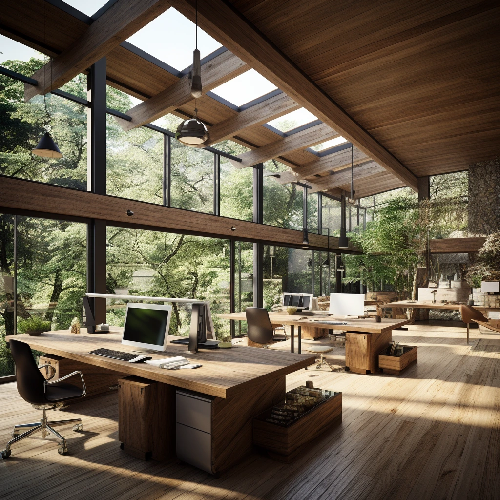 산림 속 루스틱-모던 사무실: 산림 속에서 루스틱한 매력과 현대적인 시설이 조화를 이루는 사무실을 디자인합니다. 나무와 돌과 같은 천연 재료, 자연광을 위한 큰 창문, 직원들이 자연적인 환경에서 일할 수 있는 개방형 테라스를 활용합니다.
