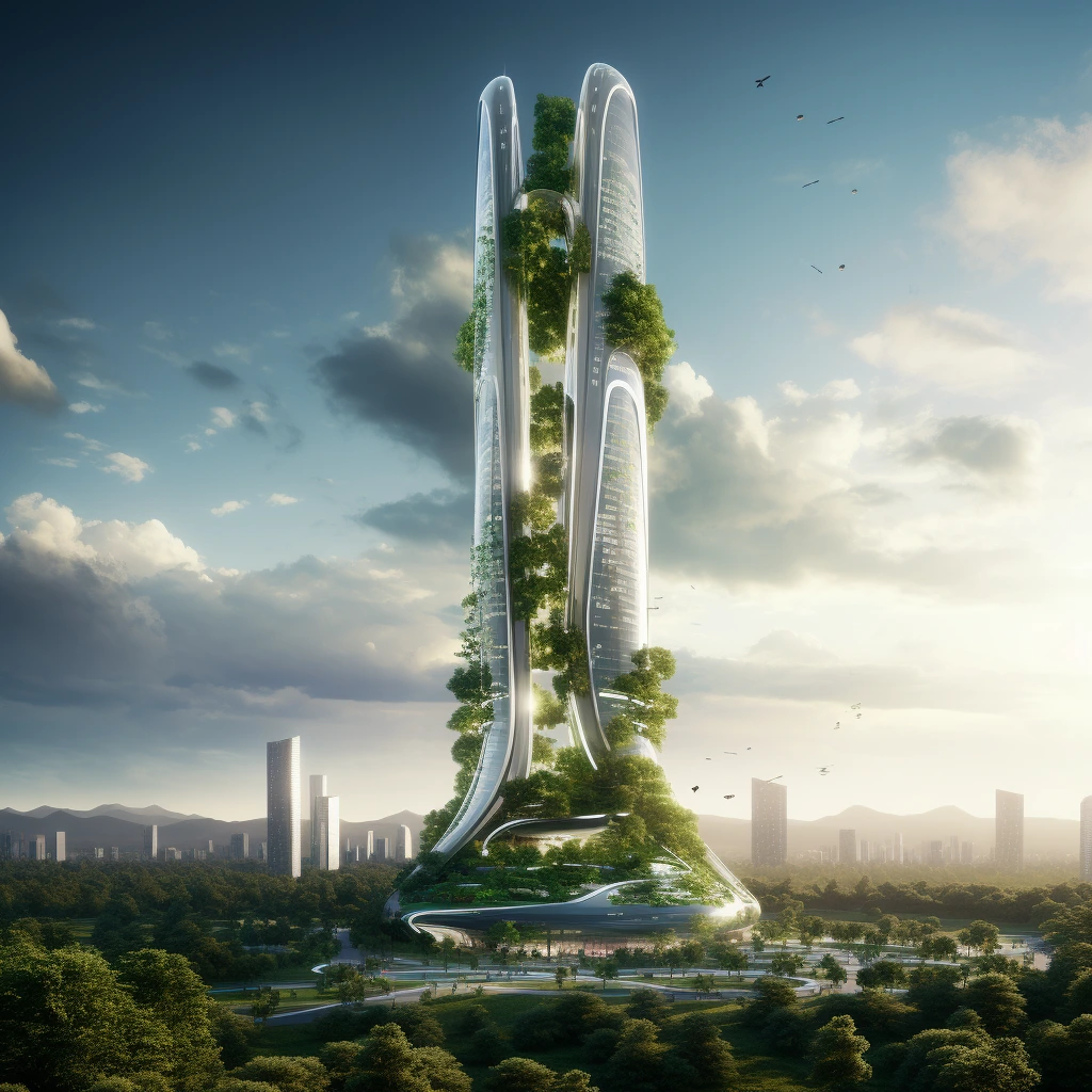 미래지향적인 친환경 사무실 타워: 현대적이고 미래지향적인 외관을 가진 초고층 스카이스크레이퍼를 디자인합니다. 생태 친화적인 녹색 벽면, 태양광 패널, 풍력 터빈을 활용합니다. 건물은 유리 외벽과 동적 조명을 가지며, 지속 가능성과 미적 요소를 위해 다양한 레벨에 테라스 가든을 포함합니다.