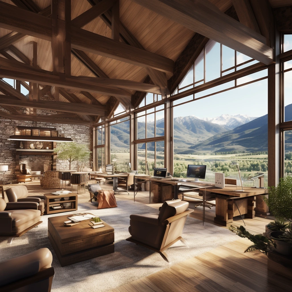 산악 리트리트 사무 공간: 경치 좋은 산악 지역에 위치한 리트리트 사무 공간을 디자인합니다. 노출된 들보, 큰 돌 벽난로, 팀 빌딩과 휴식을 위한 아늑한 공동 공간을 포함합니다.