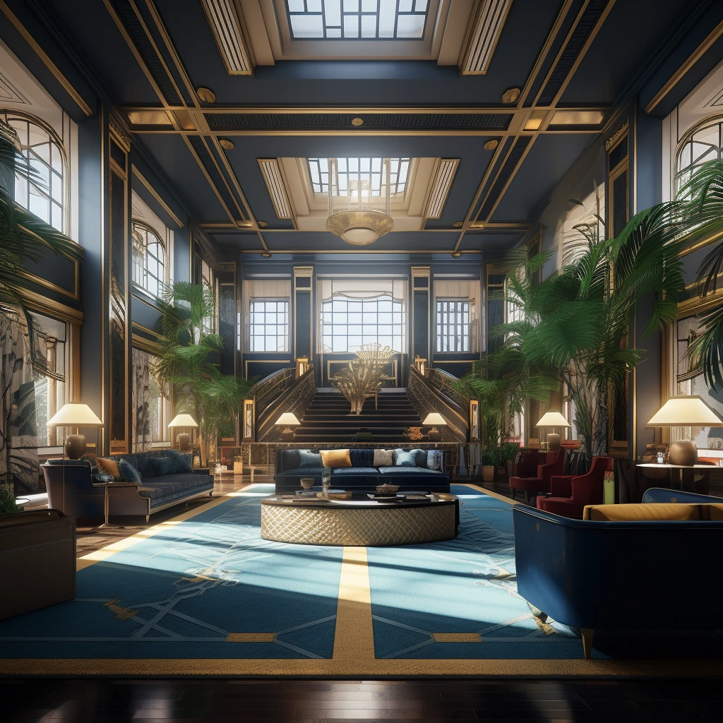 아르데코 스타일의 사무실 건물: 아르데코 시대에서 영감을 받은 사무실 건물을 디자인합니다. 기하학적인 형태, 풍부한 색상, 화려한 디테일을 포함합니다. 시대를 반영하는 예술과 장식이 있는 웅장한 로비와 소셜 모임을 위한 옥상 정원을 포함합니다.