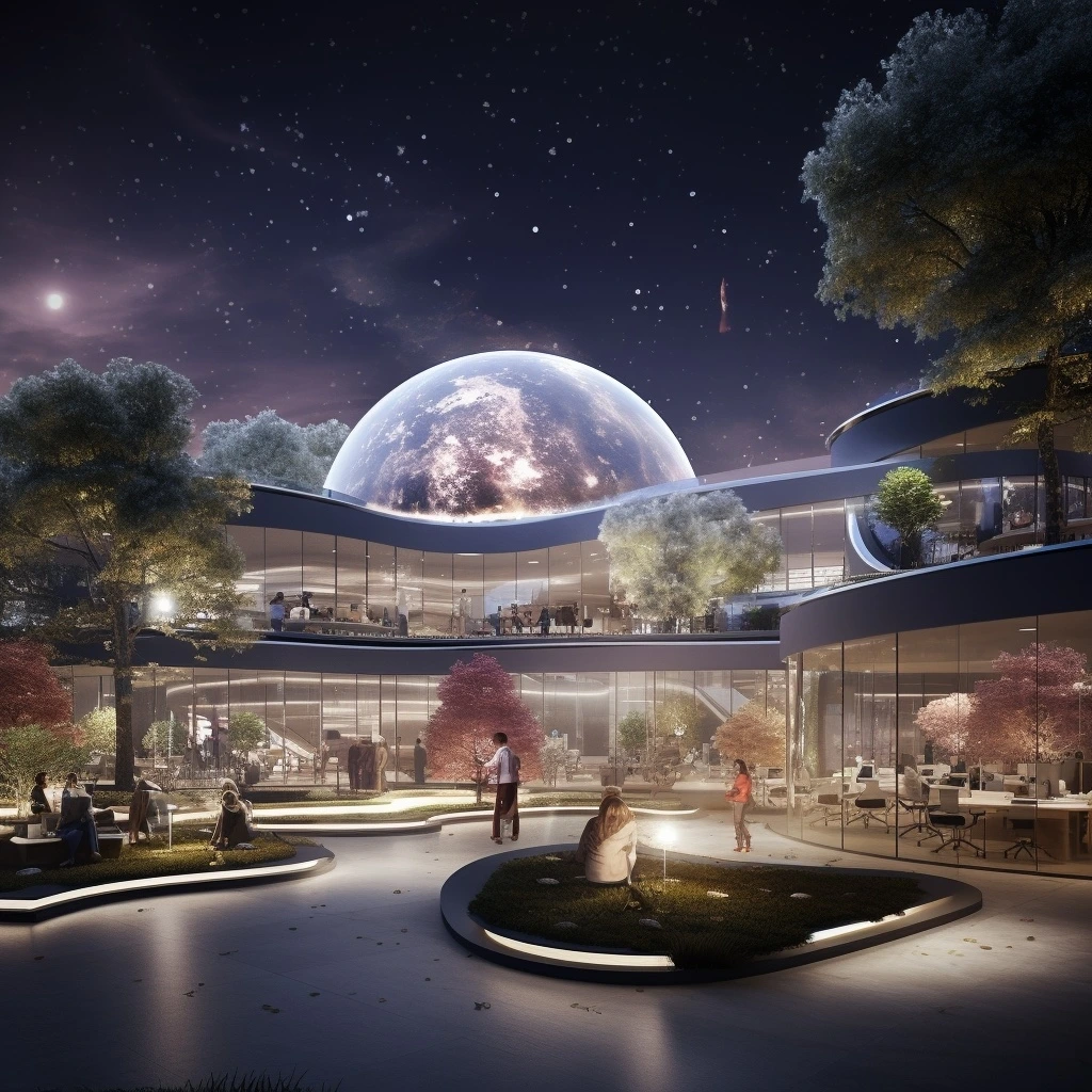 우주 테마의 혁신적인 오피스 파크: 우주 탐사 테마의 오피스 파크를 디자인합니다. 돔 모양의 건물, 별빛 효과의 조명, 우주에 관한 상호작용적 전시물을 포함합니다. 이 공간은 경이로움과 미래 지향적인 마인드셋을 일깨워줍니다.