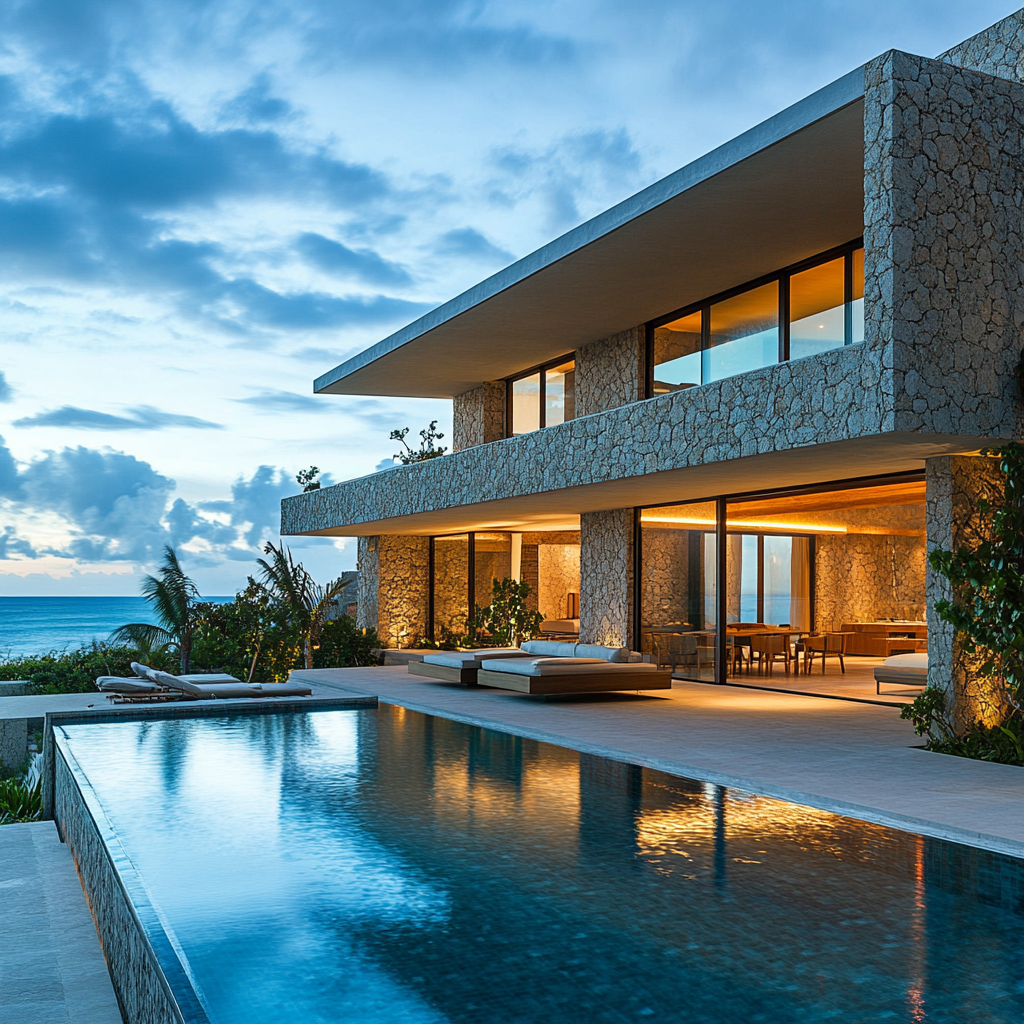 예: Design a beachfront villa that blends with the coastal landscape, featuring natural stone and panoramic ocean views. (자연석과 파노라마 오션 뷰를 특징으로 하는 해변가 빌라를 설계해 주세요.)