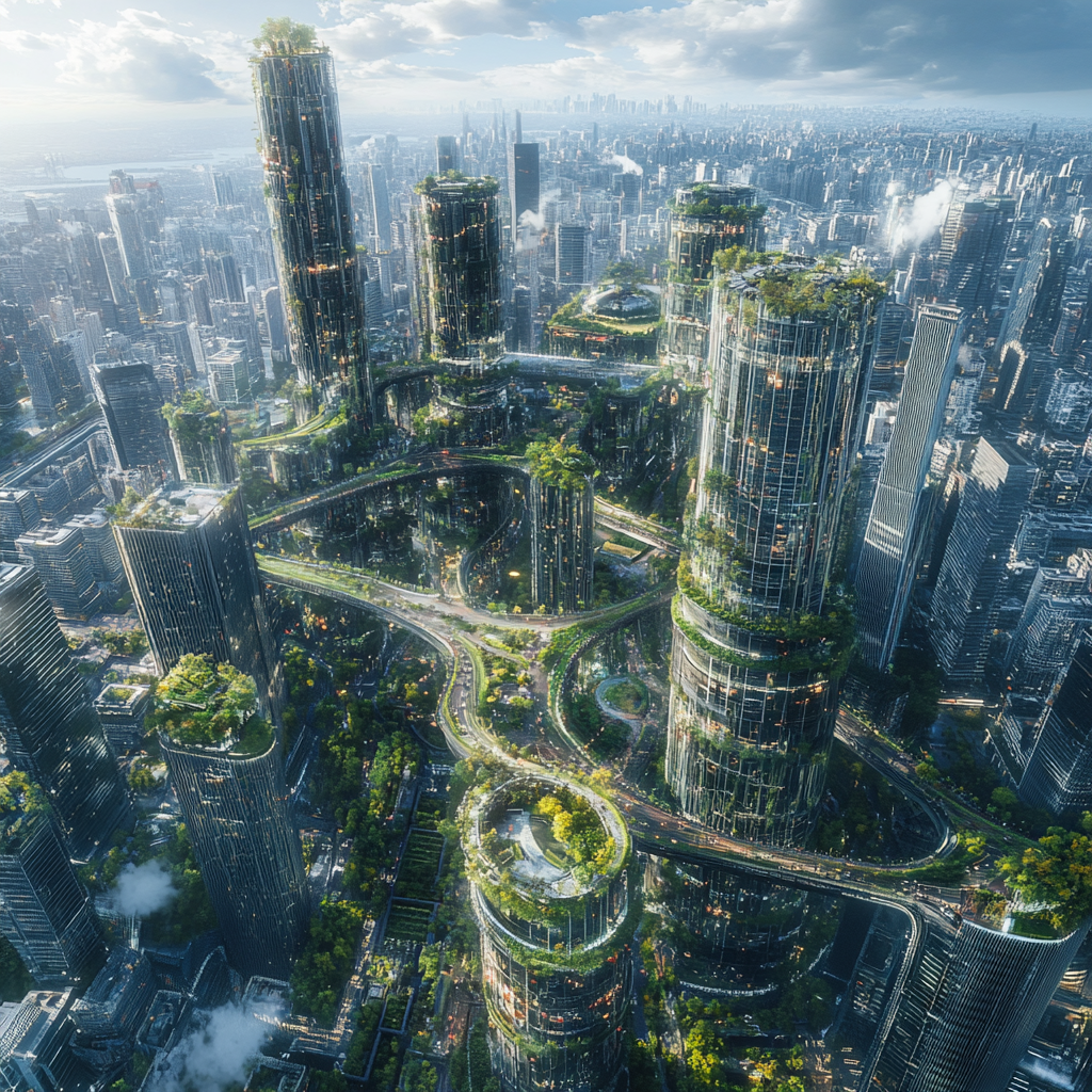 예: Show an aerial view of a futuristic city skyline with interconnected skyscrapers and elevated green spaces. (초고층 빌딩과 공중 정원이 연결된 미래 도시 스카이라인의 항공 뷰를 보여 주세요.)
