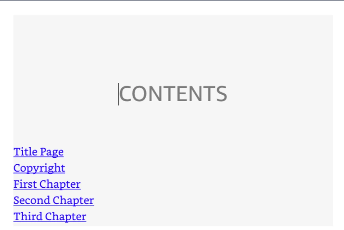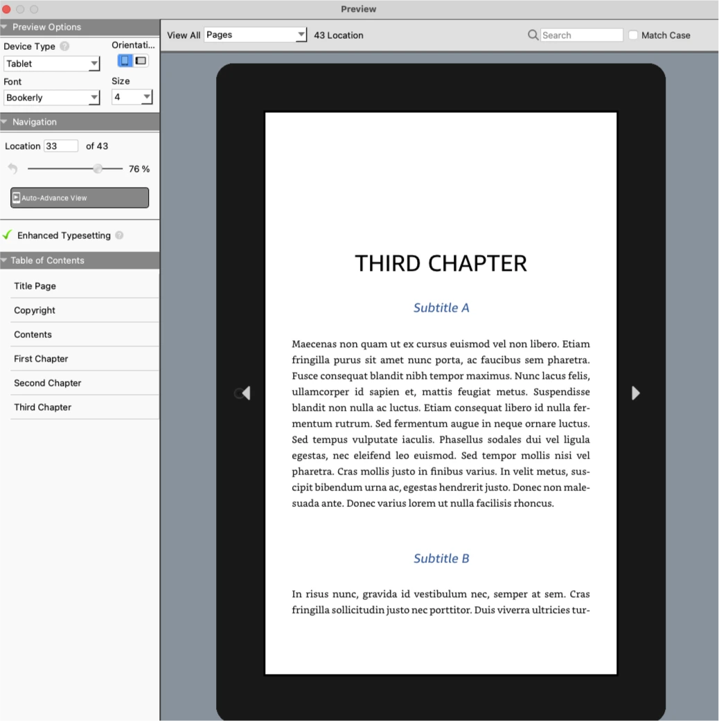 좌측의 메뉴들을 눌러서 전자책이 정확하게 읽히는지 확인합니다. Table of Contents의 각 챕터들을 선택해서 올바른 텍스트가 뜨는지 확인합니다.