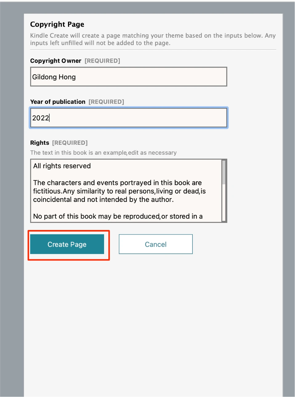 Copyright Owner에 저자명을 넣어주고, 출판연도를 넣어줍니다. Create Page를 클릭합니다.