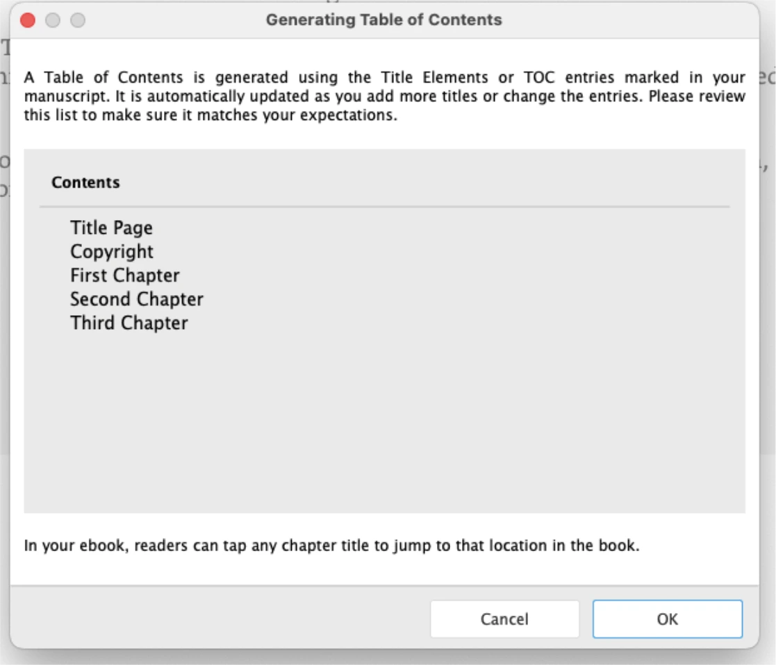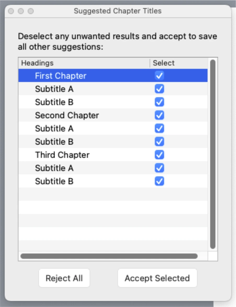 프로그램이 원고를 스캔해서 목차를 자동으로 만들어 보여줍니다. 실제 원고와 100% 일치한다면 Accept Selected를 눌러줍니다. 완전히 일치하지는 않는 경우 Reject All 버튼을 누르고 직접 목차를 설정해 주면 됩니다.
