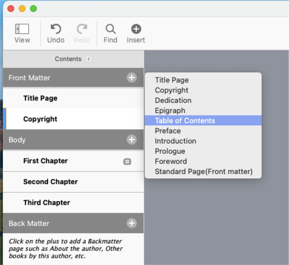 Front Matter 우측의 플러스 버튼을 누르고 Table of Contents를 클릭하여 목차를 자동생성합니다.