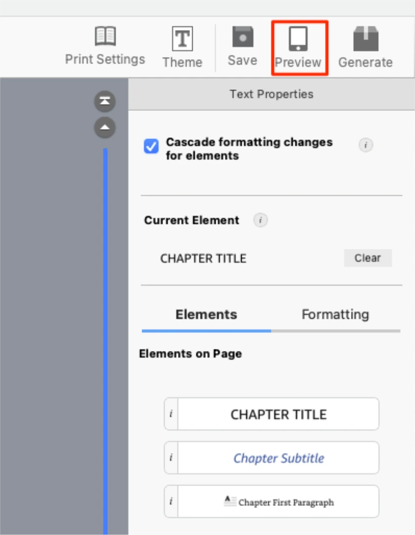 프로그램 상단의 Preview 버튼을 눌러서 실제로 전자책 기기로 보이는 형태를 미리 보기 합니다.