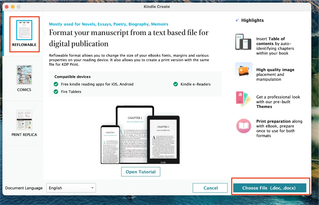 프로그램을 열어서 REFLOWABLE을 선택합니다. REFLOWABLE은 글자 크기를 독자가 조절할 수 있어서 가독성이 좋으며, 대부분 글로 이루어진 원고에 적합한, 표준적인 전자책 포맷입니다. 프로그램 아래의 Choose File을 클릭합니다. 구글문서에서 다운로드한 Docx 파일을 선택합니다.