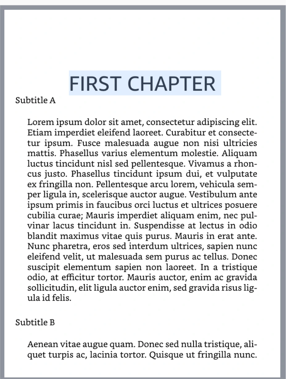 원고 양식은 아래의 이미지처럼 챕터, 서브 챕터 두 가지로만 나누어 주십시오. 이렇게 하면 전자책 변환이 쉬워집니다. 원고의 구조를 복잡하게 만들면 가독성이 떨어집니다.
